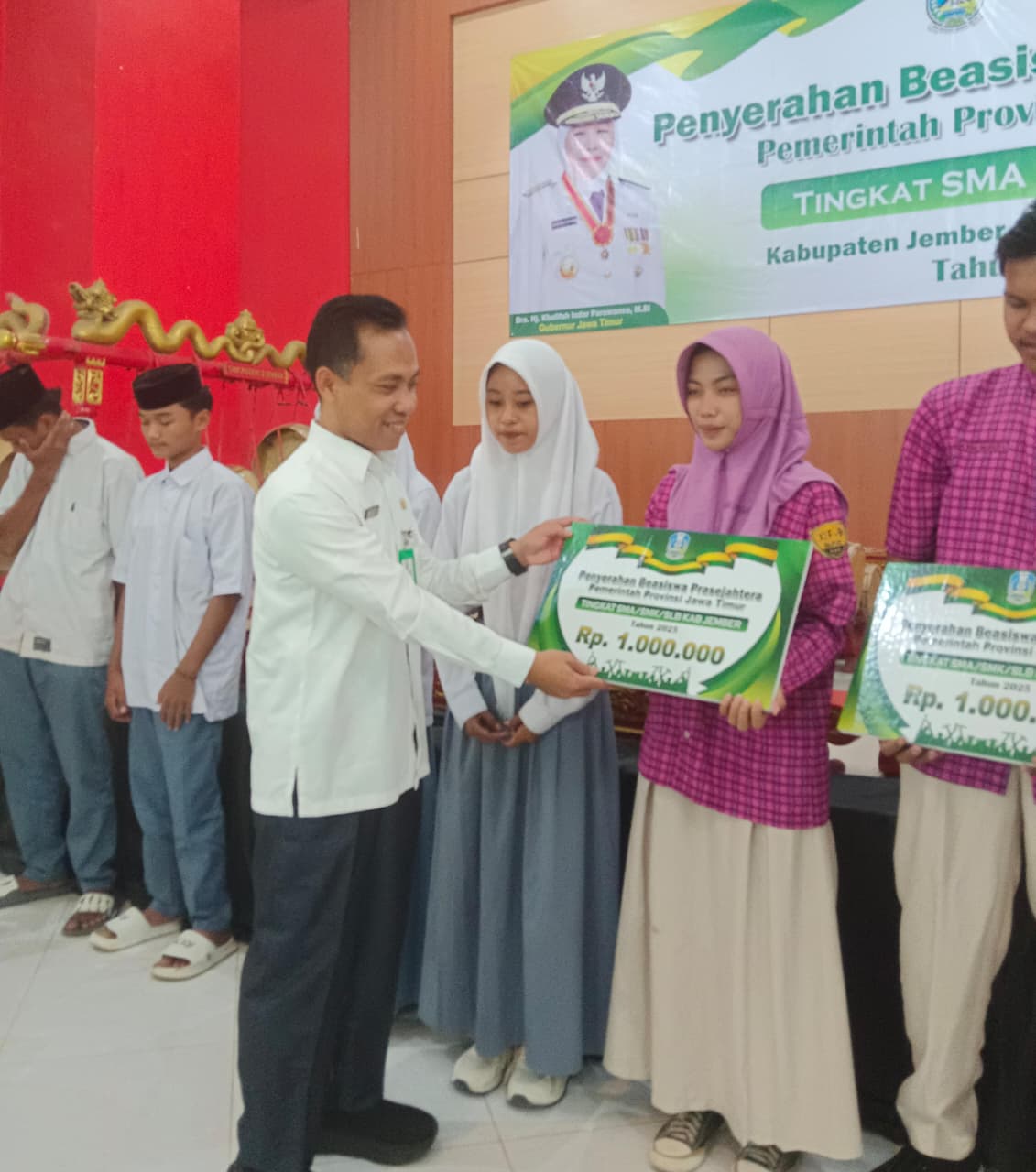 Penyerahan beasiswa dilaksanakan di Aula SMKN 2 Jember, Rabu (24/12/2025). Di bawah naungan Cabang Dinas Pendidikan (Cabdin) Wilayah Jember, rinciannya meliputi 1.779 siswa dari Kabupaten Jember dan 688 siswa dari Kabupaten Lumajang.